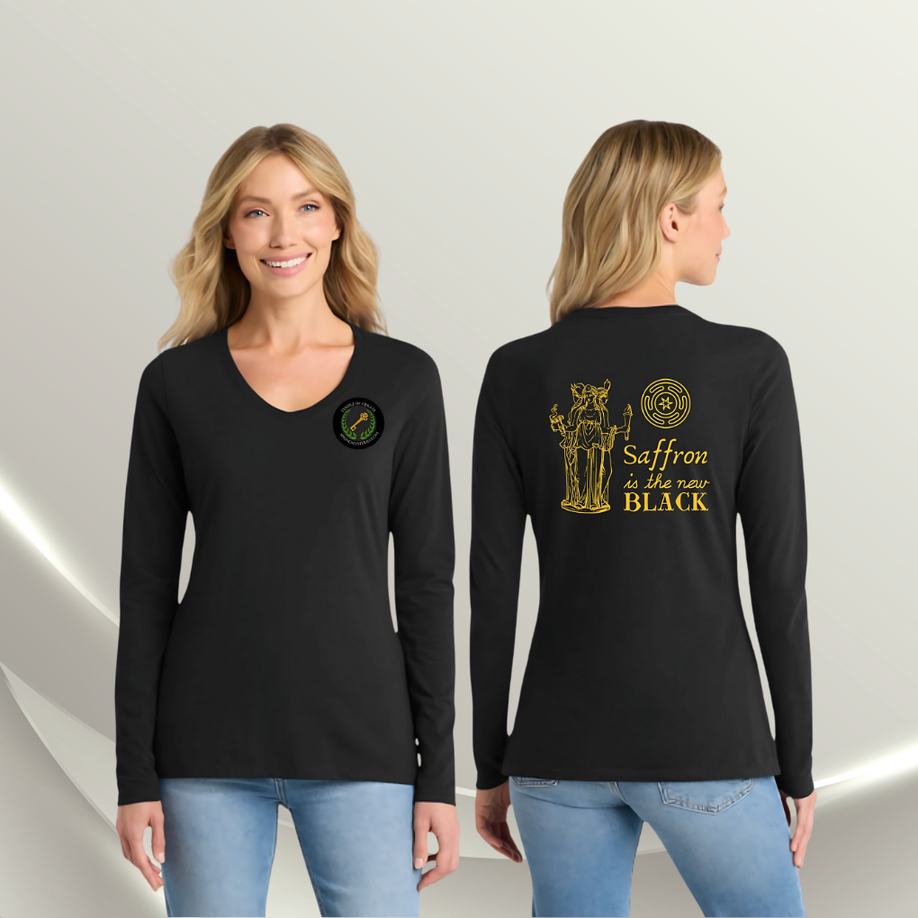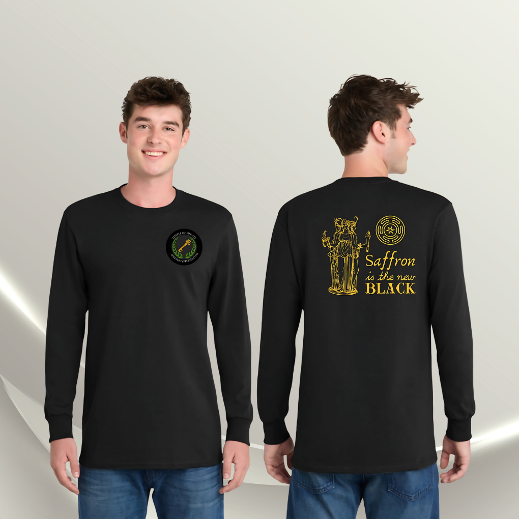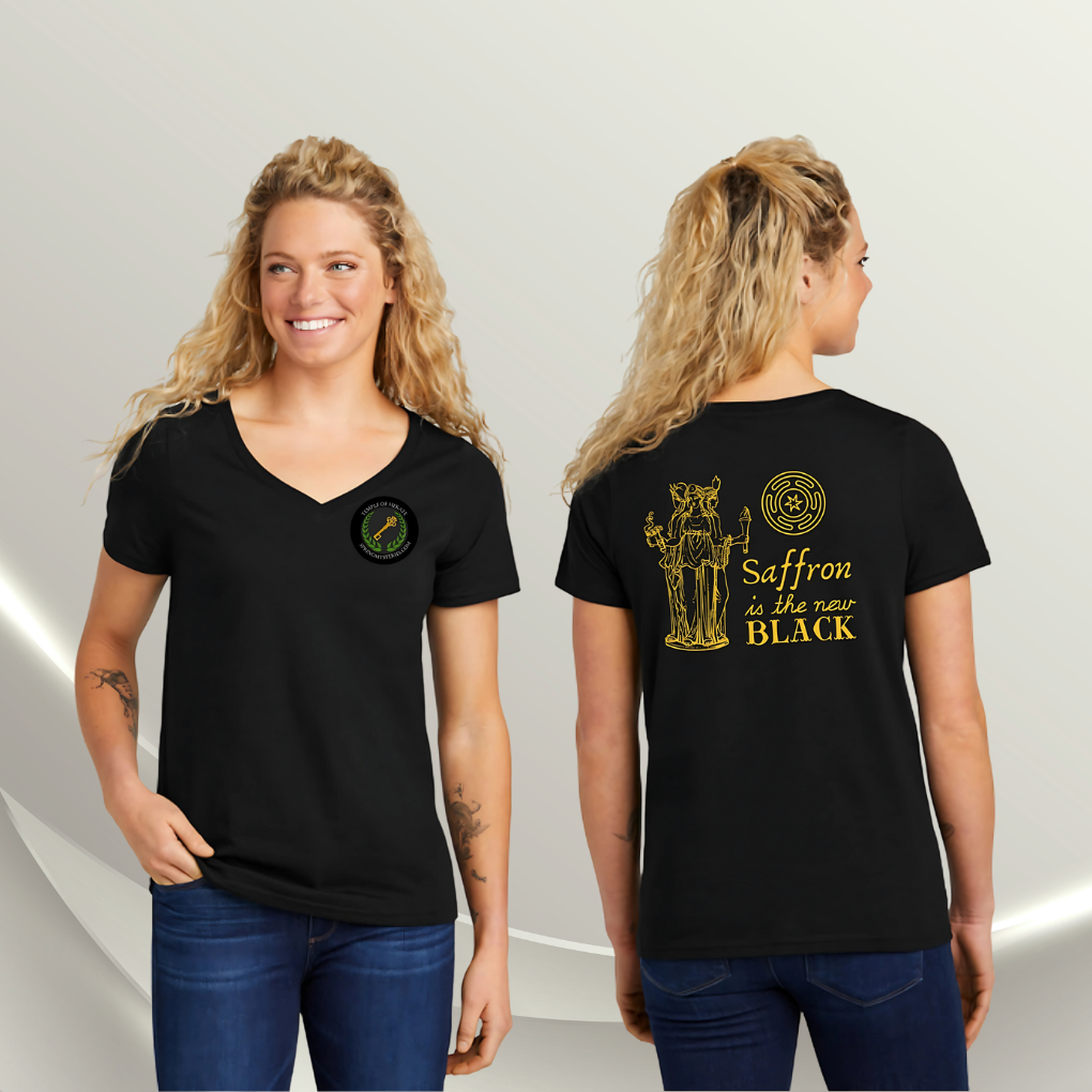 This black tee features bold saffron-colored lettering — embodying transformation, mystery, and power. A torchlight against the dark, honoring the Goddess of the Crossroads.